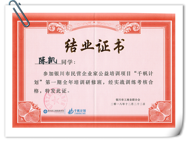 伊百盛陳凱榮獲“千帆計劃”培訓合格結業證書