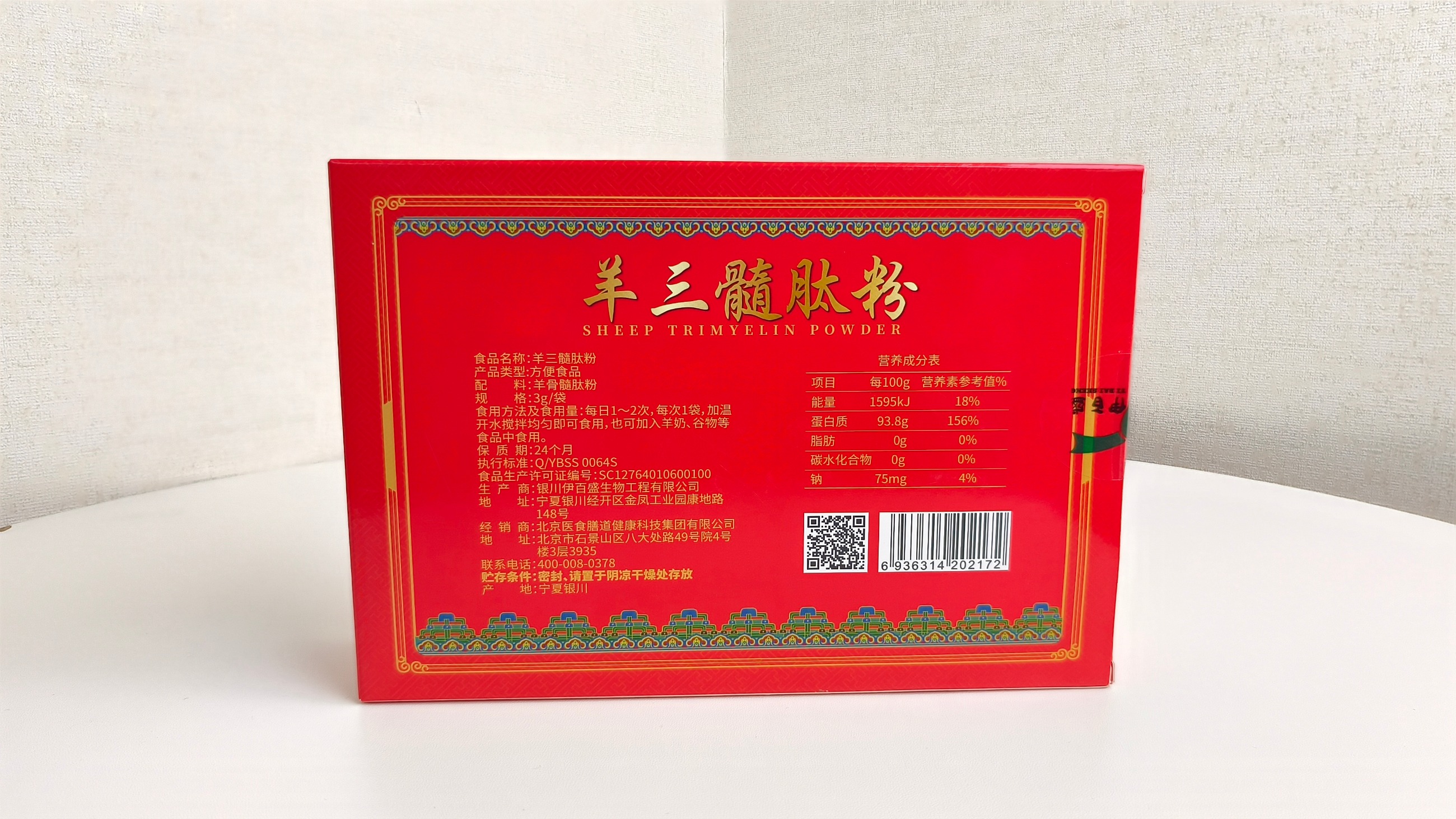 【食品名稱】:羊三髓肽粉【產品類型】:方便食品【配 料】:羊骨髓肽粉【規 格】:3g/袋【食用方法及食用量】:每日1~2次,每次1袋,加溫開水攪拌均勻即可食用, 也可加入羊奶、谷物等食品中食用。【保 質 期】:24個月【執行標準】:Q/YBSS 0064S【食品生產許可證編號】:SC12764010600100